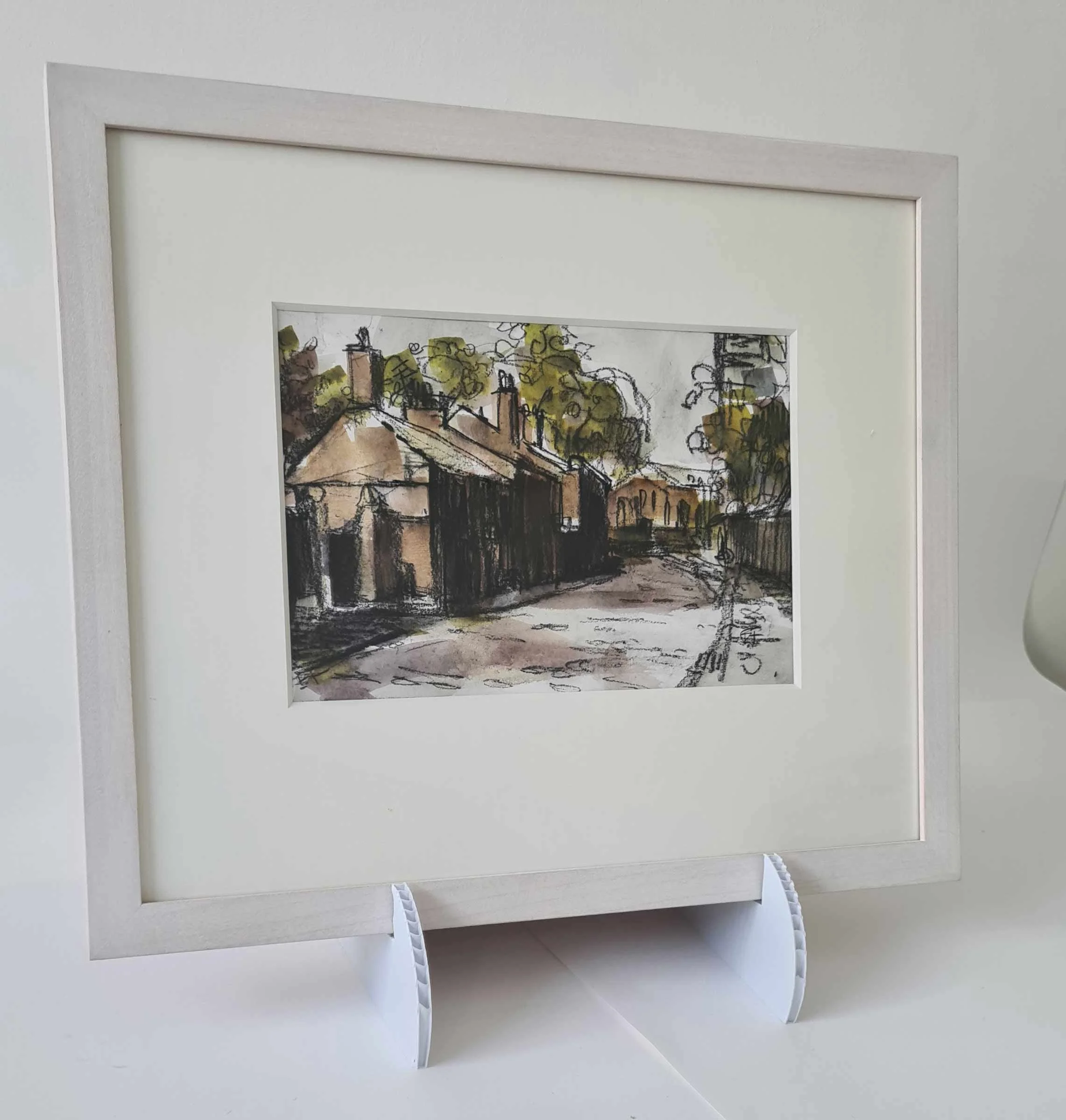 Image size: 14 × 24cms. Frame size: 35 × 40cms. Off white wooden style with off white mount. Media: Mix of Carbon pencil, Woodie pencil and ink onto watercolour paper.