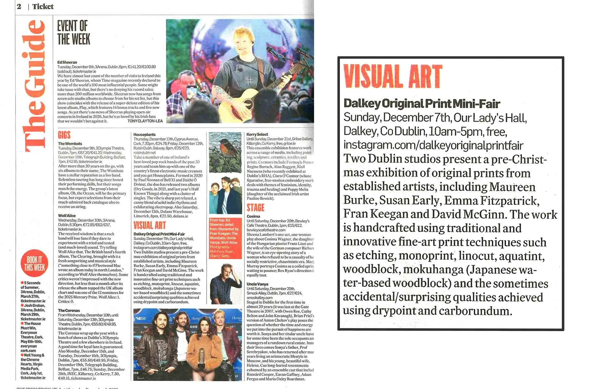 Delighted to be mentioned in The Irish Times The Ticket, alongside the artists taking part in the inaugural Dalkey Original Print Fair 2025, which I initiated and organised with the support of the other artists, among others. The fair took place in Our Lady’s Hall, Dalkey, and was kindly sponsored by The Queen’s Dalkey. Many thanks to Tony Clayton-Lea (@tclaytonlea) for the listing.